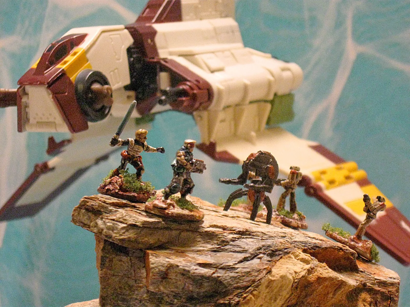 "Hurry, to the Shuttle!" a Star Wars Transformer for the Republic Attack Shuttle, scales pretty close.