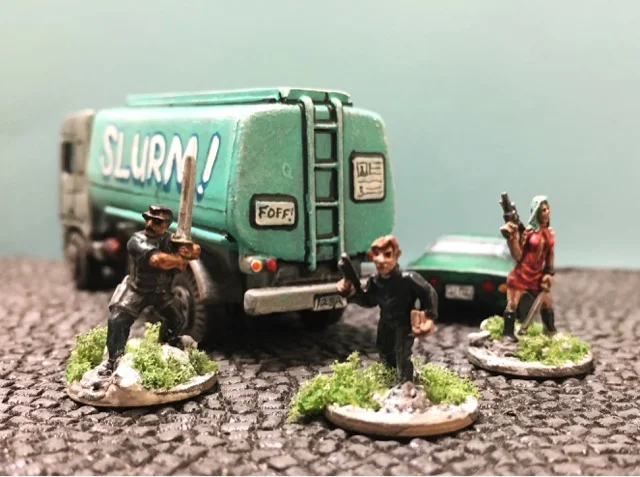 Family shot, I think all or mostly Highlander Studio 15s. The SLURM truck is a cheap dollar store repaint.